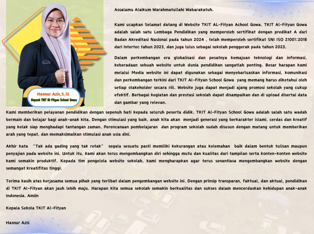 Pendidikan TKIT AL-FITYAN SCHOOL GOWA Berita Agenda Prestasi Kurikulum Kesiswaan Fasilitas Profil Kelulusan Tulisan Inspirasi SDM Berita TKIT Semarak Muharram 1447 Hijriah TKIT Al Fityan School Gowa Read More » July 17, 2025 No Comments Berita TKIT Bersama Mendidik Anak Hebat: Kolaborasi Orang tua dan Guru dalam Sosialisasi KBM Tahun Ajaran 2025/2026 Read More » July 17, 2025 No Comments Berita TKIT MPLS TKIT Al Fityan “Aku Siap Jadi Anak Mandiri” Read More » July 17, 2025 No Comments Berita TKIT Drama Musikal Pentas Seni TKIT Al-Fityan School Gowa Read More » May 28, 2025 No Comments Berita TKIT Seminar Parenting dan Laporan Perkembangan Anak Didik Triwulan 3 Read More » April 26, 2025 No Comments Berita TKIT Praktek Manasik Haji, Peserta Didik TKIT Al-Fityan Mengenal Rukun Islam Ke-5 Read More » April 15, 2025 No Comments « Sebelumnya Page1 Page2 Page3 Page4 Page5 Selanjutnya »